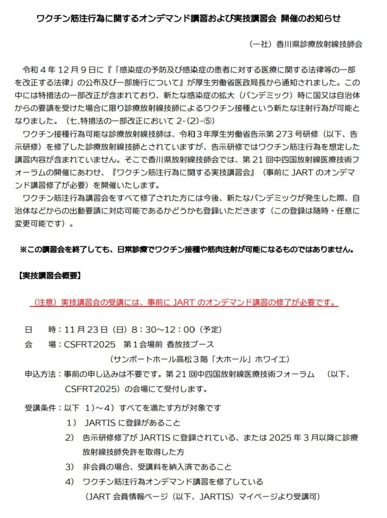 【CSFRTにて開催】ワクチン筋注行為に関するオンデマンド講習および実技講習会 開催のお知らせ 11月23日(日)、CSFRT2025会場内において開催されるワクチン筋注行為に関する講習会のご案内です。 ※事前にJARTISよりオンデマンド講習を修了する必要がありますのでご留意ください。 詳細については下記をクリックしてご確認ください。