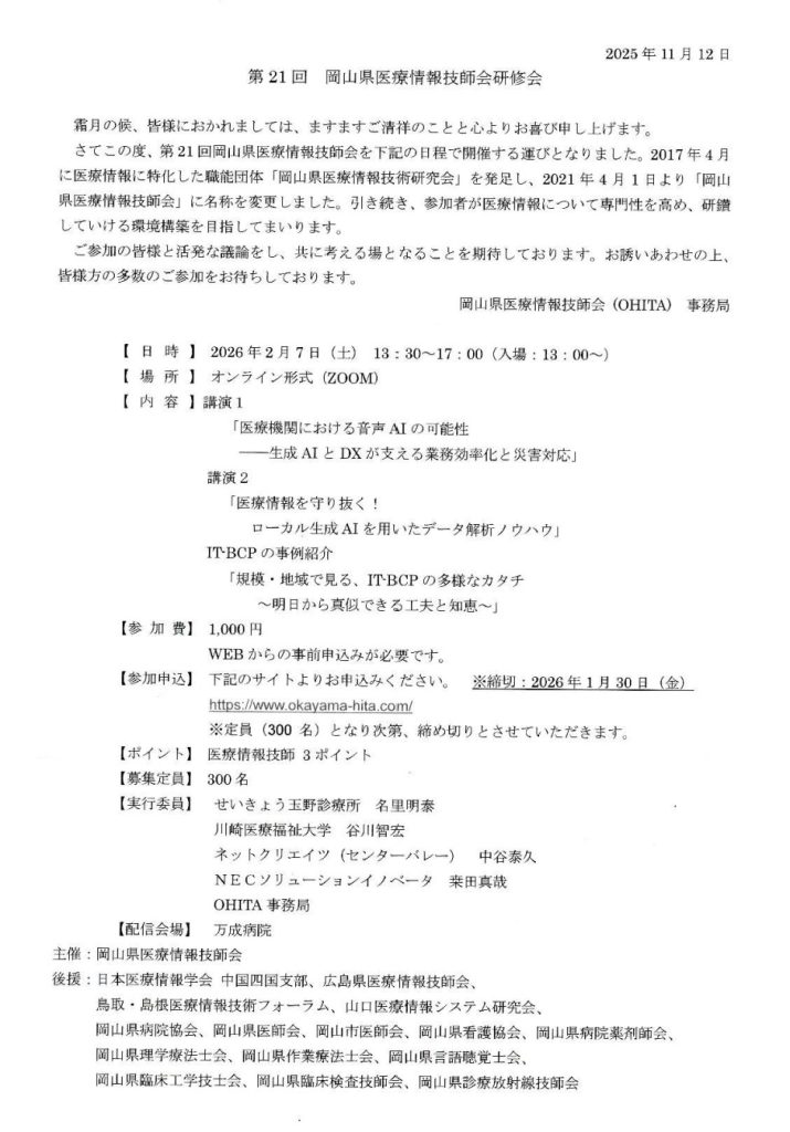第21回 岡山県医療情報技師会研修会のご案内です。