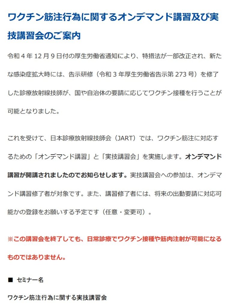 【6月14日】ワクチン筋注行為に関する実技講習会のご案内 令和8年度通常総会にあわせてワクチン筋注行為に関する実技講習会を開催いたします。 事前にJARTホームページにてオンデマンド講習を受講してください。 詳細については下記のファイルにてご確認ください