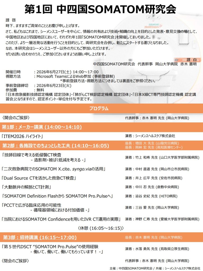 【6月27日】第1回 中四国SOMATOM研究会のお知らせ 6月27日(土)14:00より Microsoft TeamsによるWeb形式にて開催される 第1回 中四国SOMATOM研究会のお知らせです。 詳細については下記にてご確認ください。 よろしくお願いいたします。