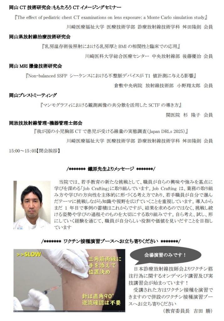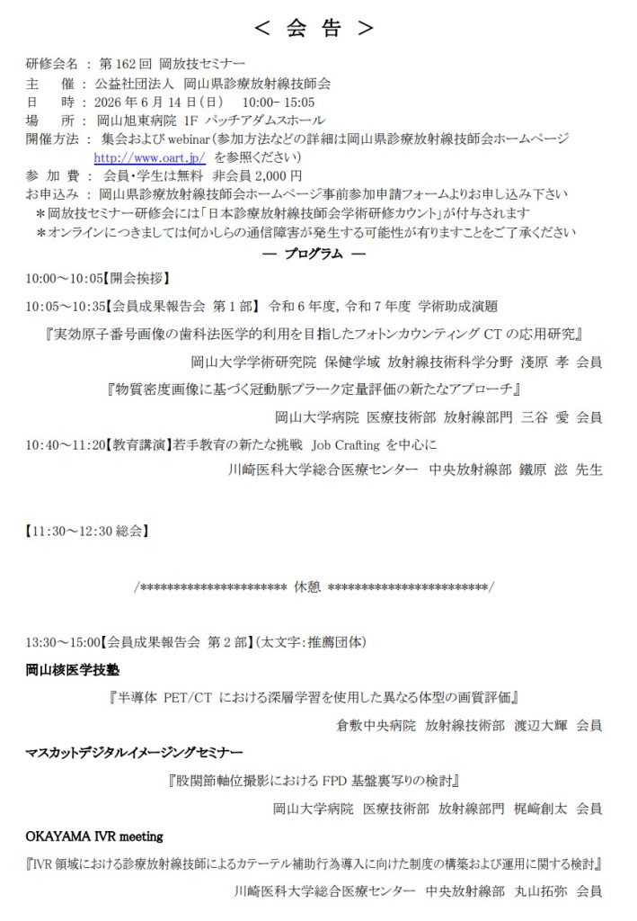 【6月14日】第162回 岡放技セミナーのご案内 通常総会と同日6月14日(日)10:00~ 岡山旭東病院にて開催される第162回岡放技セミナーのご案内です。 詳細については下記のファイルにてご確認ください。 参加申込期間は5月1日(金)~6月9日(火)といたします。